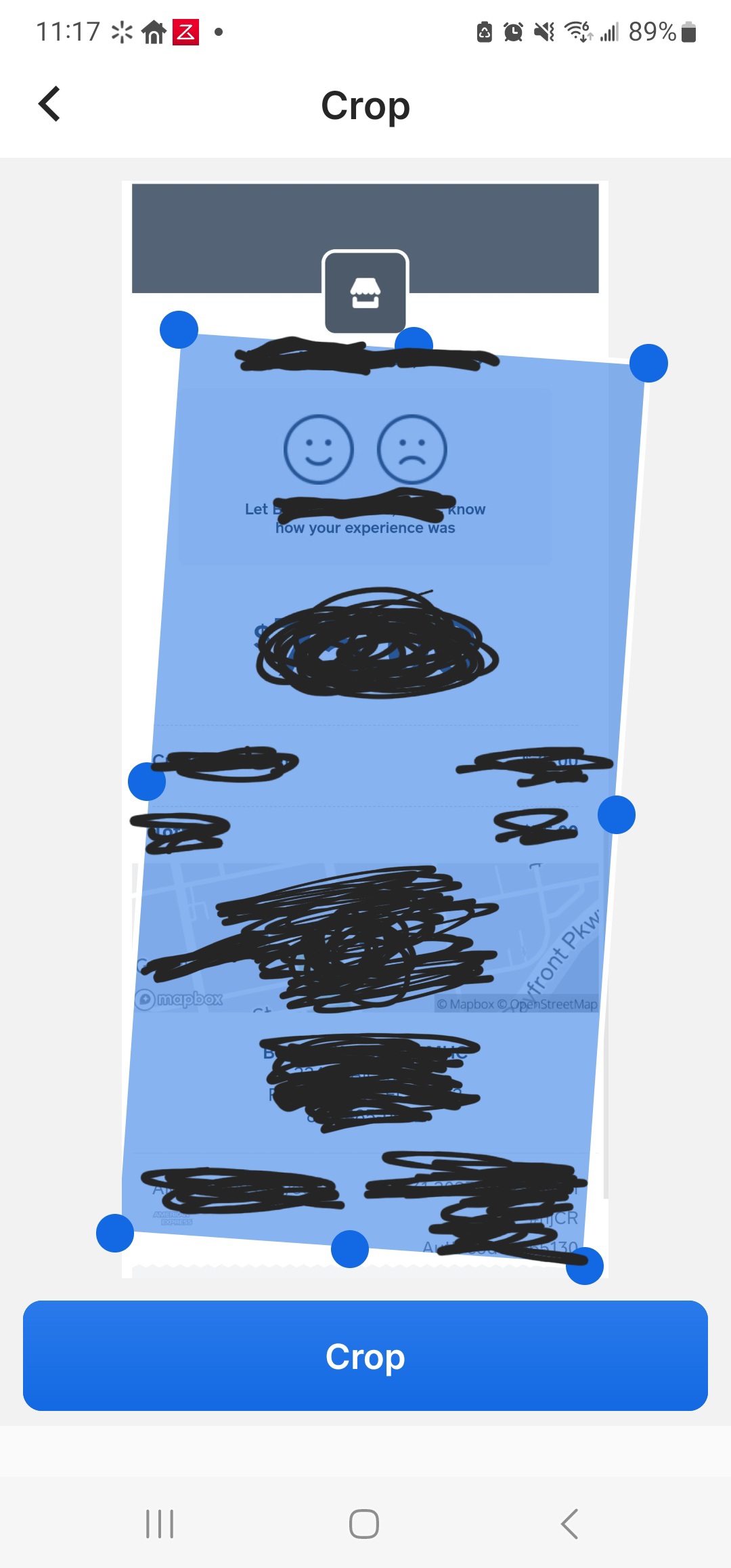 By default when it can't properly into it how to crop a receipt the app seems to give a skewed rectangle. It would be great if it just starts with the full screen and allows you to squeeze it down since I oftentimes crop the images before uploading them then by default there would be no cropping. As it is I have to adjust it every time as I almost never have a skewed rectangle.